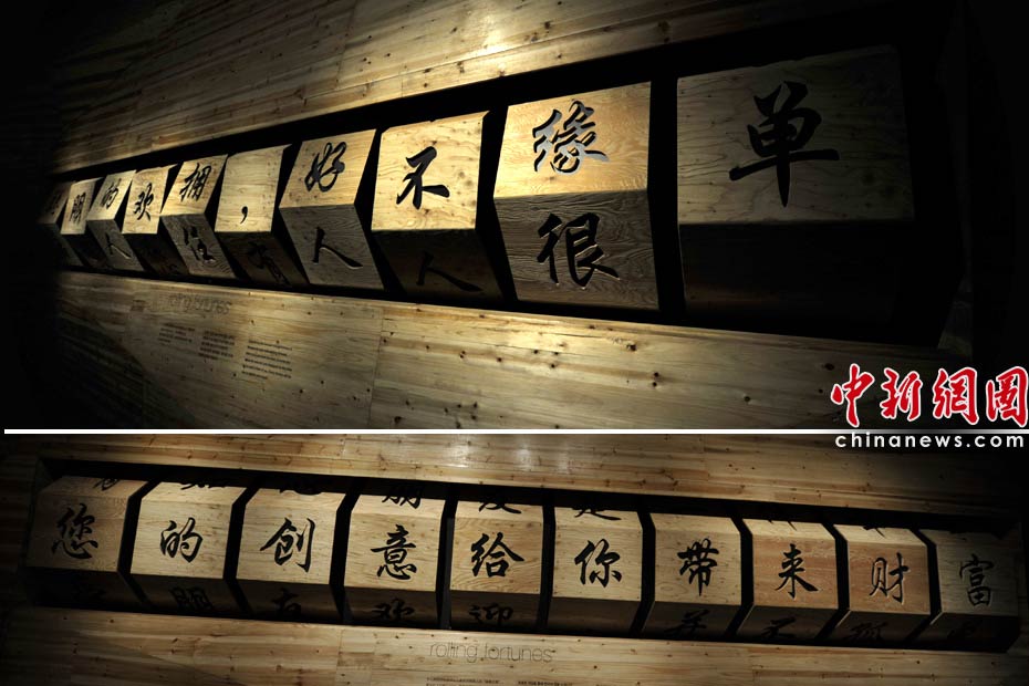 互動體驗游戲——游客每拉一下搖桿,會使墻上的木制滾動機滾動,滾動機是由各種漢字組成,每次都會出現一句諸如“您的創意給您帶來財富”這樣的吉利話,很討游客的歡心。中新網記者 王紅綱 攝