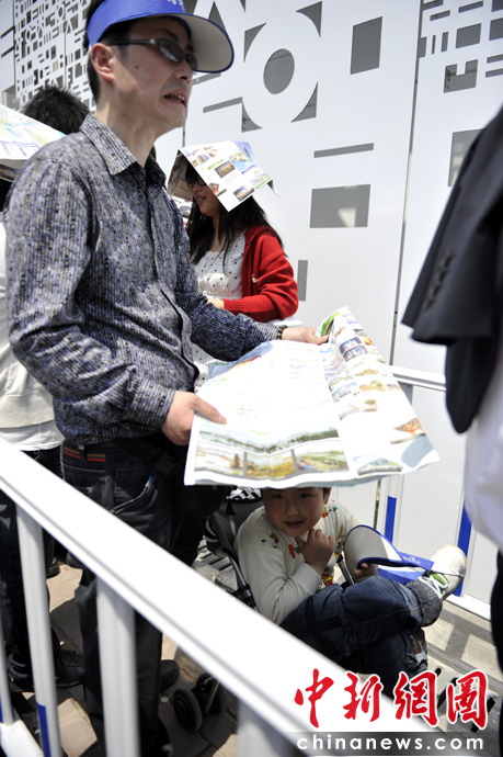 友情提示:韓國館為熱門場館,參觀游客較多,排隊時間約為2小時,請做好心理準備。圖為韓國館外的排隊者中,一個父親為兒子遮陽,小家伙很愜意,父親曬的呲牙咧嘴。中新網記者 王紅綱 攝
