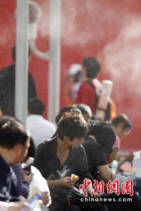 2010年5月2日,上海世博園區啟動各項控溫降溫設施應對高溫。圖為游客休息區內啟動噴霧降溫系統。中新社記者 盛佳鵬 攝
