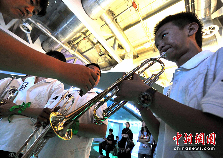 5月2日清晨,來(lái)自玉樹(shù)地震災(zāi)區(qū)結(jié)古鎮(zhèn)的藏族小樂(lè)手巴東珠,含著姐姐在地震中不幸遇難的悲痛心情,與小白楊中學(xué)生管弦樂(lè)團(tuán)來(lái)到上海世博會(huì),為中國(guó)青海館觀眾獻(xiàn)上一曲《在那遙遠(yuǎn)的地方》。他悲歡交融的情懷和演藝,感動(dòng)全場(chǎng)。巴東珠之前還是青海省人民醫(yī)院為地震傷員做藏語(yǔ)翻譯的志愿者。中新社記者 賈國(guó)榮 攝