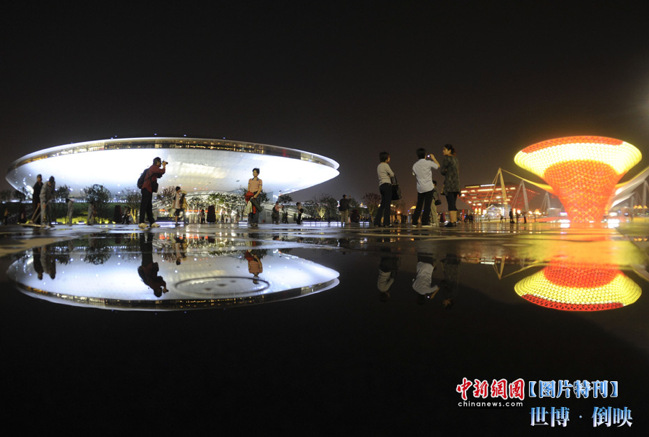 世博園慶典廣場上,積水倒映著世博文化中心。中新社記者 廖攀 攝