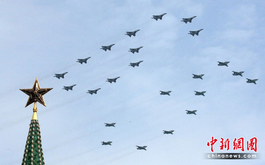當地時間5月4日,在俄羅斯首都莫斯科,參加彩排的戰機編隊飛過紅場上空。俄羅斯將于5月9日隆重紀念衛國戰爭勝利65周年。圖片來源:中國新聞網