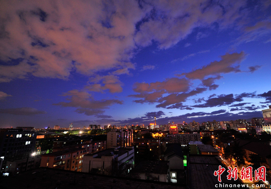 5月5日立夏,京城降雨今晨剛剛結(jié)束,霧氣伺機(jī)又起。傍晚時(shí)分,隨著四級(jí)北風(fēng)的到來,京城天氣逐漸轉(zhuǎn)晴,霧氣慢慢消散天空彤云密布夜色瑰麗。中新網(wǎng)記者 金碩 攝