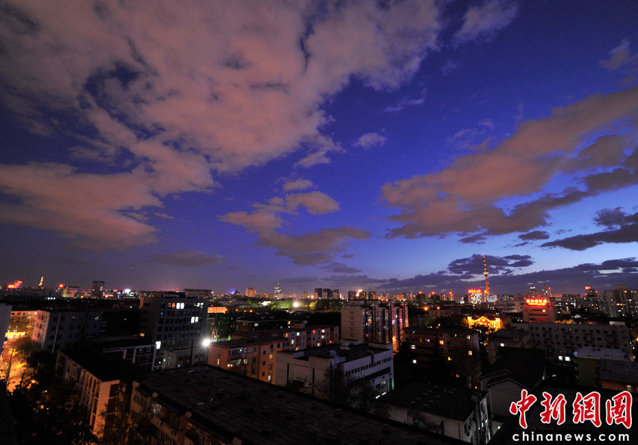 5月5日立夏,京城降雨今晨剛剛結(jié)束,霧氣伺機(jī)又起。傍晚時分,隨著四級北風(fēng)的到來,京城天氣逐漸轉(zhuǎn)晴,霧氣慢慢消散天空彤云密布夜色瑰麗。中新網(wǎng)記者 金碩 攝