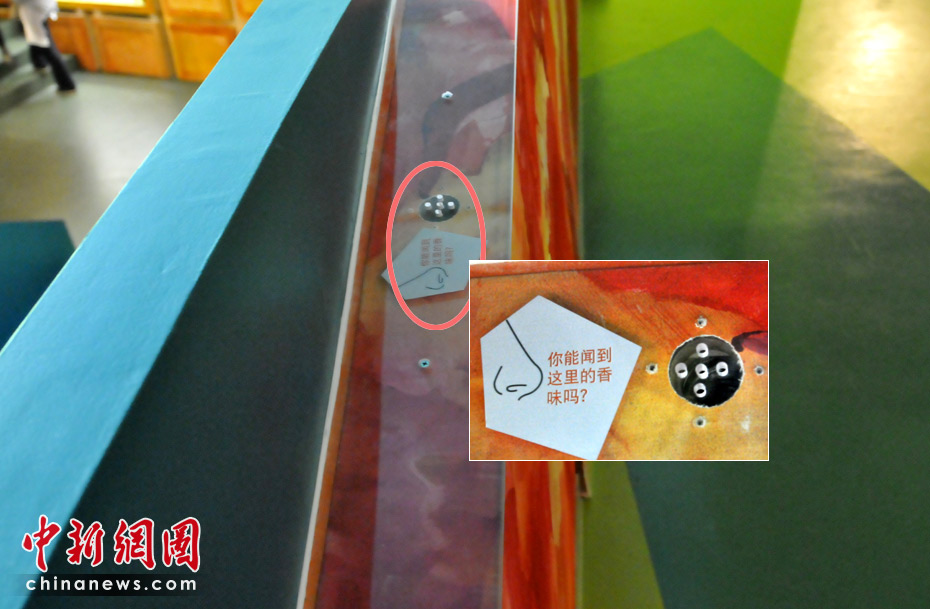 樓梯扶手上也“暗藏玄機”,這些小孔都是有香味發出的。中新網記者 王紅綱 攝