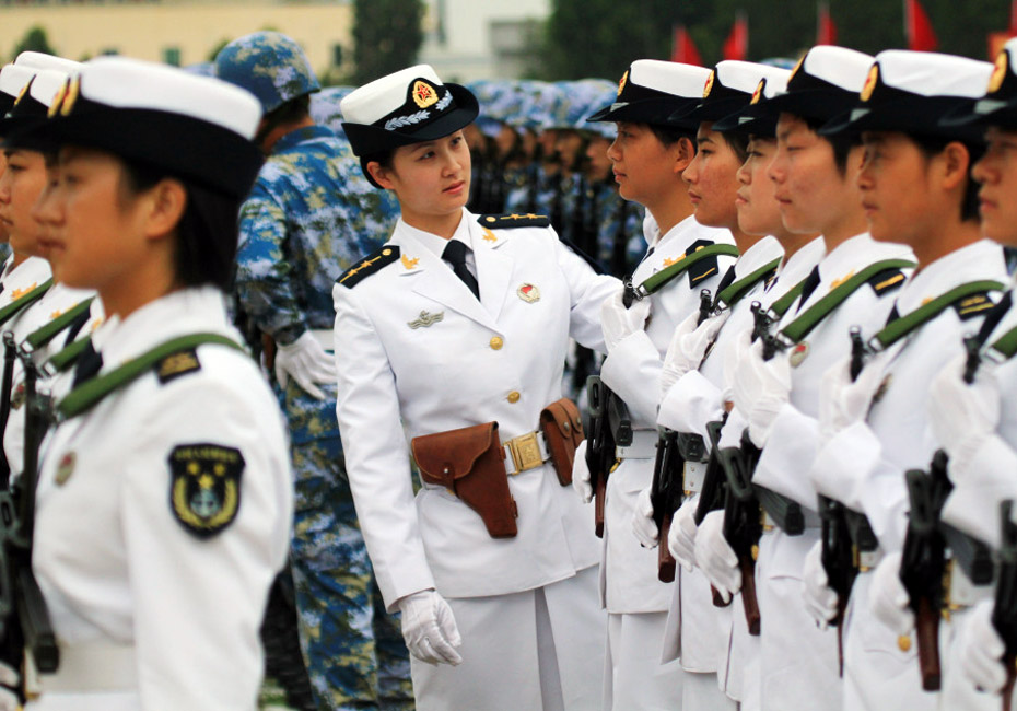 參加閱兵式的海軍陸戰(zhàn)隊(duì)女隊(duì)員在做準(zhǔn)備。圖片來(lái)源:新華網(wǎng) 查春明攝