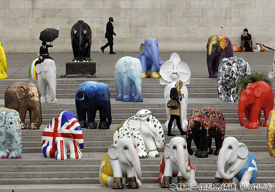 5月4日,2010年倫敦大象游行活動當日在特拉法爾加廣場啟動。260個真象大小的彩繪雕塑將在倫敦各處展出,并將于6月30日拍賣為慈善組織籌款。圖片來源:中國新聞網>>點擊觀看詳細內容