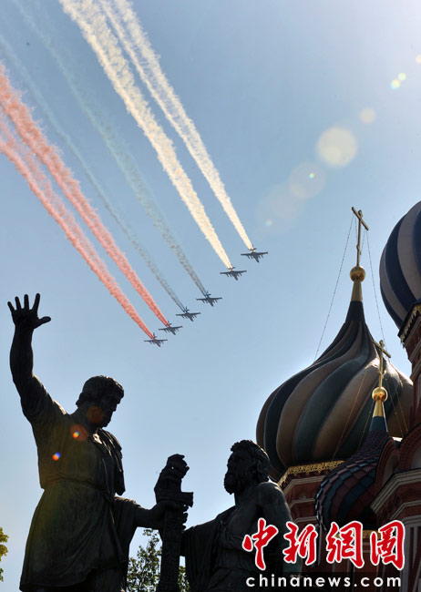 5月9日,俄羅斯在莫斯科紅場舉行盛大的閱兵式,慶祝衛國戰爭勝利65周年。莫斯科時間5月9日上午10點(北京時間9日下午2點)許,閱兵式正式開始。圖為空中梯隊飛越紅場上空。