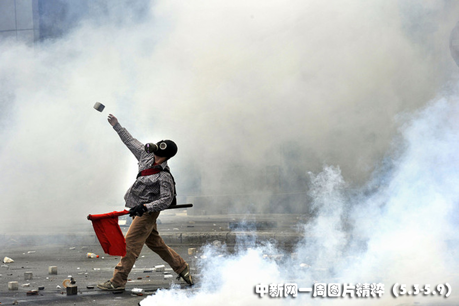5月5日周三,在雅典的國會(huì)大樓附近,一名抗議者朝警察擲石塊。