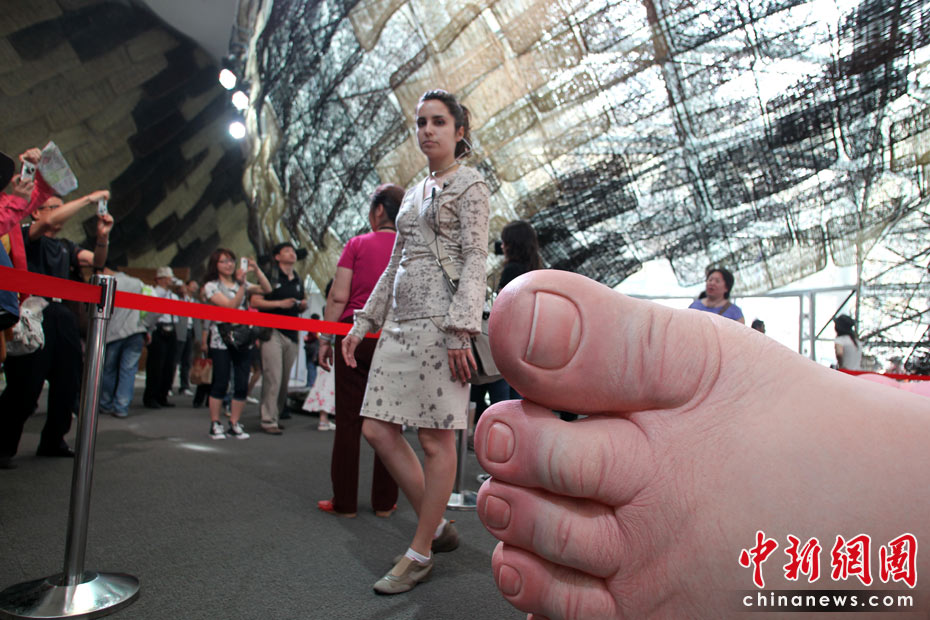 圖為西班牙館內游客在巨型寶寶的腳下留影。 中新社記者 蘇丹 攝