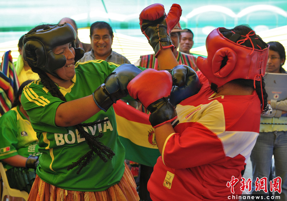 5月13日,秘魯利馬高地舉辦的傳統食品博覽會上,兩名安第斯農民婦女穿著象征秘魯和玻利維亞的裙子同臺搏擊妙趣橫生。圖片來源:中國新聞網
