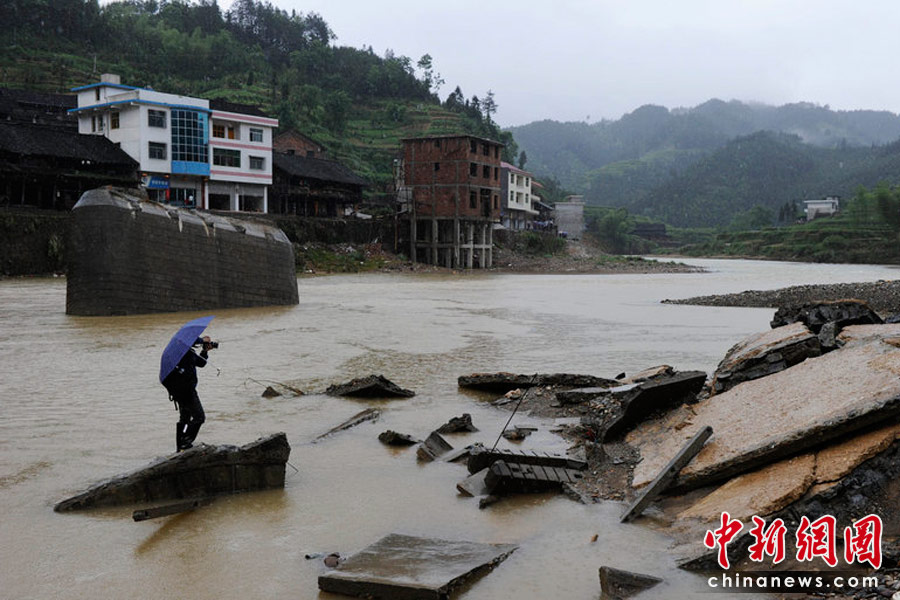 連日來,湖南省懷化市溆浦縣普降暴雨,致山洪暴發(fā),造成嚴(yán)重的洪澇災(zāi)害。溆浦縣22.35萬人受災(zāi),直接經(jīng)濟損失2.1億元。其中兩江、善溪等鄉(xiāng)鎮(zhèn)受災(zāi)嚴(yán)重,橋梁中斷、道路被毀、房屋倒塌,一度形成與外界隔絕的“孤島”。洪災(zāi)發(fā)生后,當(dāng)?shù)卣ν度耄\送生活物資、打通臨時通道等,救災(zāi)工作全面展開。郭立亮/CFP