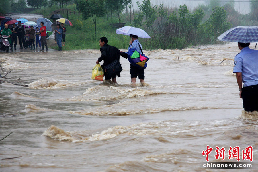 2010年5月18日,江西省婺源縣太白鎮(zhèn)朱村村民在當地公安干警的護送下通過被淹公路橋。當日,江西全省近50個縣出現普降暴雨,其中婺源縣、 降雨量以婺源縣153毫米為最大,當地已緊急轉移群眾4000余人。到筆者發(fā)稿止,在該縣太白鎮(zhèn)通往德興市的主要公路被迫中斷,樂安河太白段水位均已超出警界線。卓忠偉/CFP