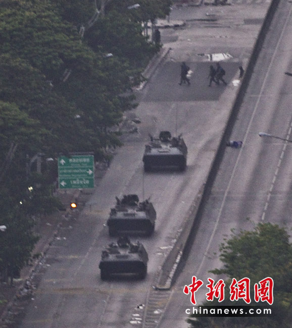19日清晨,數百名軍警在武裝車輛的掩護下向反政府示威者在曼谷的大本營聚集。自上周四紅衫軍與政府在曼谷爆發沖突以來,已經導致39人死亡,數百人受傷。