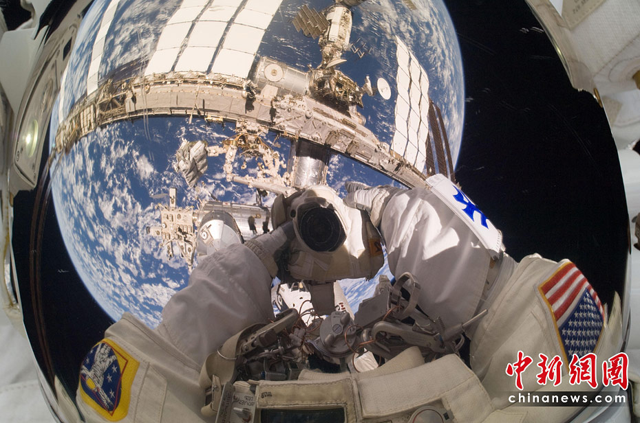 美國當地時間5月17日,“亞特蘭蒂斯”號航天飛機宇航員加雷特·賴斯曼和史蒂夫·鮑恩進行了與國際空間站對接后的首次太空行走。圖片來源:中國新聞網