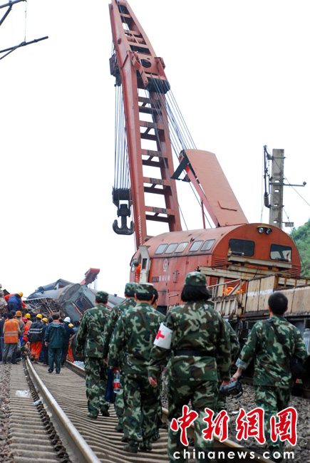 5月23日凌晨2時(shí)10分,滬昆鐵路江西東鄉(xiāng)段發(fā)生一起客運(yùn)列車脫線事故,截至上午9時(shí),已有10人遇難,車內(nèi)乘客全部被轉(zhuǎn)移,現(xiàn)場救援工作正在緊張進(jìn)行。事故發(fā)生后,南京軍區(qū)武警,江西省消防、交警,中鐵電氣化局、醫(yī)療等部門立即組織近萬名人員參與搶險(xiǎn)救災(zāi),目前現(xiàn)場已有10余臺(tái)挖土機(jī)和吊車參與救援。中新社發(fā) 劉占昆 攝