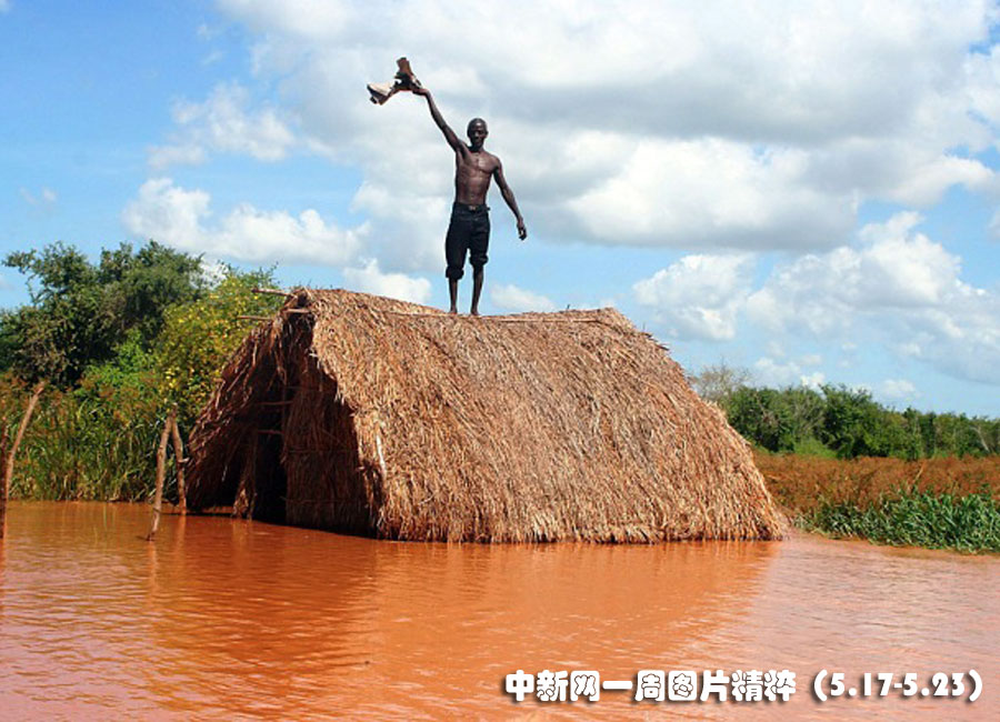5月20日肯尼亞一名村民的茅草房被水淹沒,他站在房頂尋求幫助。一個電廠開閘放水導致塔納河決堤,造成100多人無家可歸。