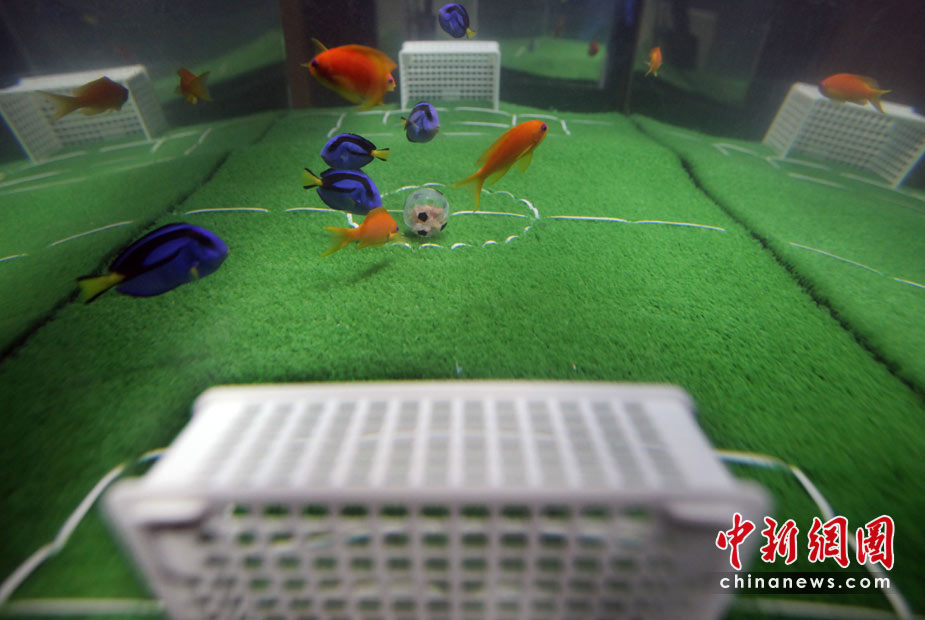 5月23日,日本橫濱八景島海洋世界水族館中,一群魚兒在“踢足球”,藍色魚代表日本隊,橘色魚代表荷蘭隊。在2010年南非“世界杯”上,日本將迎戰荷蘭隊。