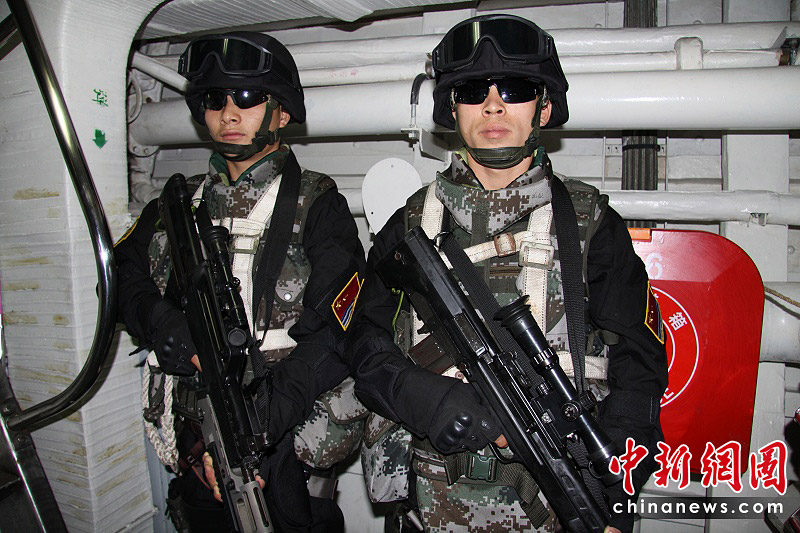 3月7日,新加坡海峽特戰(zhàn)隊(duì)員在船艙中集合。胡軍 攝