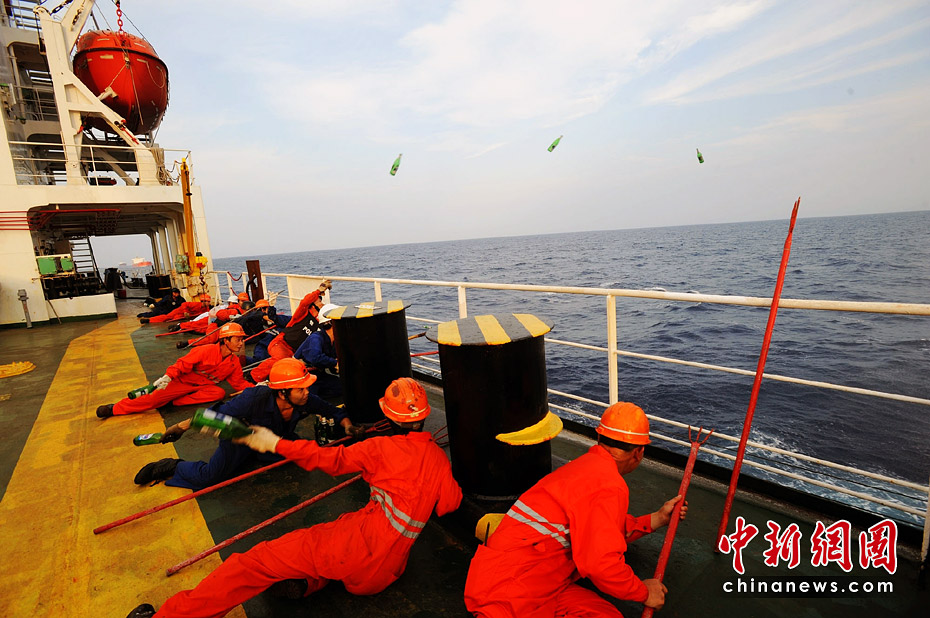 有特戰隊員在身邊,增強了船員反海盜信心。圖為演練時,船員進行投擲啤酒瓶訓練。江山 攝