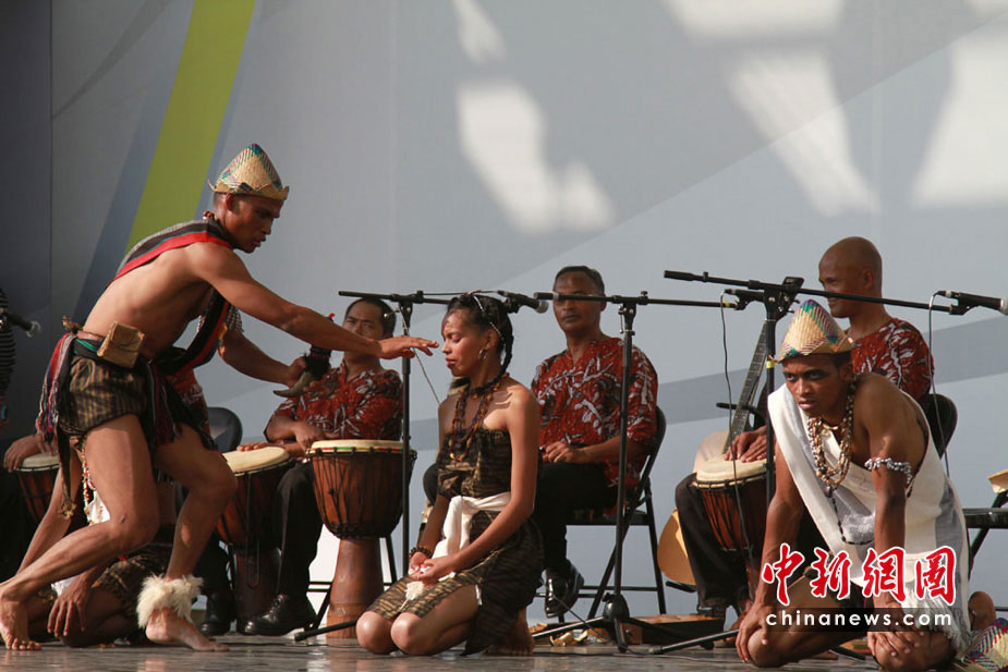 5月30日,馬達加斯加肯特思米諾歌舞團在世博園非洲廣場表演比洛傳統(tǒng)儀式,逼真的神態(tài)、激情的表演,博得許多參觀者稱贊。當天是馬達加斯加館日,世博中心內(nèi)舉行了其國家館日活動,馬方和中方代表共同出席。中新社記者 殷春永 攝