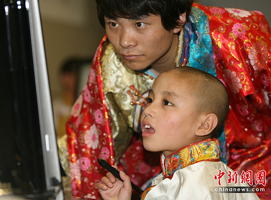 5月31日,玉樹地震孤兒多杰仁青在老師的指導下在北京國家圖書館體驗新開通的少兒數字圖書館,迎接六一兒童節。這批玉樹孤兒共23名,于5月23日抵京,由“中華少年兒童慈善救助基金會”安置。在北京度過“六一”后,他們還將休整3個月,待災區情況穩定后,中華兒慈會將與當地的民政部門協商,在征求孤兒本人意愿的基礎上,或讓他們返回原地上學,或者在內地長期居住;饡䦟⒁恢敝С炙麄兊18歲成人。中新社發 蘇丹 攝