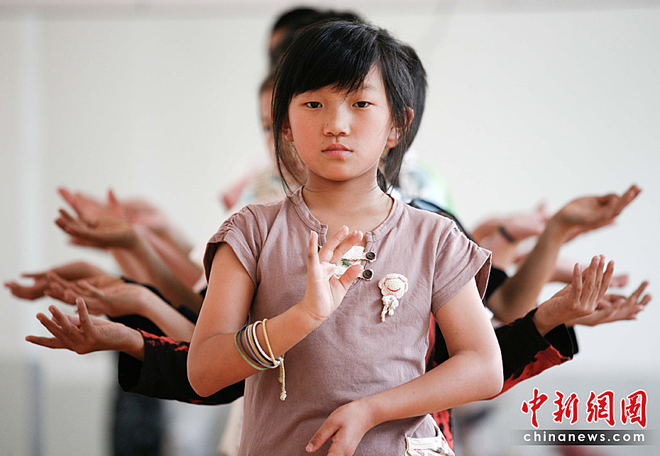 昆明市盲啞學校創建于1922年,是云南省第一所也是規模最大的一所特殊教育學校。學生除文化課程外,還根據學生特點,教授學生工藝美術、推拿按摩等技能,為他們以后的生活打下了堅實的基礎。圖為5月31日,在學習“千手觀音”舞蹈的學生。中新社記者 劉冉陽 攝