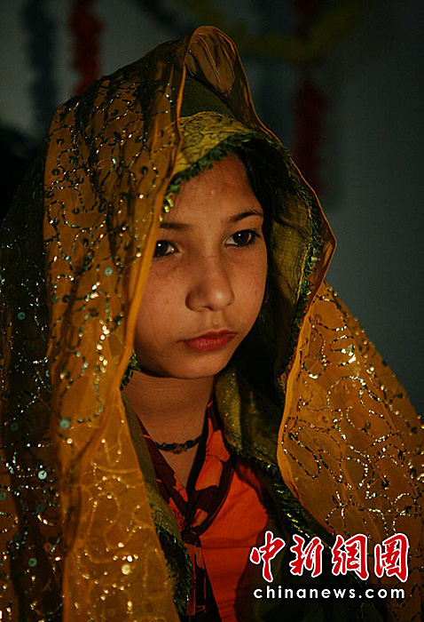 盡管在巴基斯坦童養(yǎng)媳是違法的,但這也是一個普遍存在的現(xiàn)象。近日,26歲的Shahir與12歲的Nasrin結(jié)為夫妻。Nasrin的爸爸是在兩年前去世的。因為經(jīng)濟(jì)困難,Nasrin被迫出嫁。圖片來源:CFP