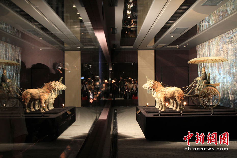 6月1日,秦始皇帝陵出土的“一號銅車馬”亮相世博會中國國家館,這是它出土30年以來第一次“駛出”陜西。這件國寶級文物在地下歷經(jīng)了2200多個春秋,于1980年出土,通體彩繪,為雙輪,單轅,駟馬系駕,總重約1061公斤。銅車馬共由3500多個零件組成,除一些金、銀飾件外,其余全部為青銅鑄件。中新社記者 殷春永 攝