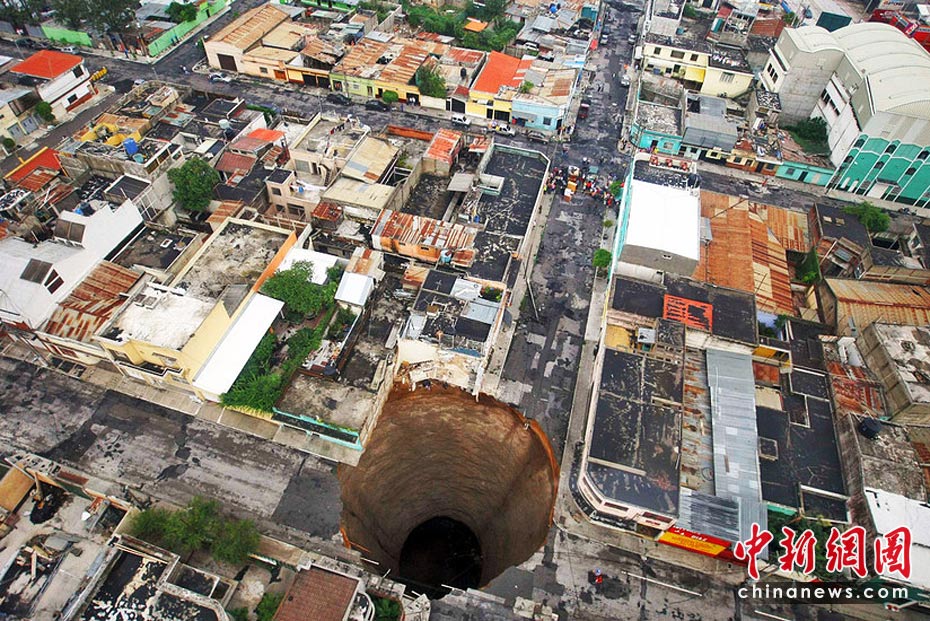 5月31日,受颶風“阿加莎”的影響,危地馬拉首都危地馬拉城出現(xiàn)一個深達60米塌陷洞,有目擊稱一幢3層建筑墜入洞中,至少造成1人死亡。圖片來源:中國新聞網(wǎng)