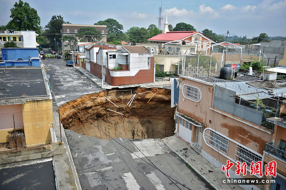5月31日,受颶風“阿加莎”的影響,危地馬拉首都危地馬拉城出現一個深達60米塌陷洞,有目擊稱一幢3層建筑墜入洞中,至少造成1人死亡。圖片來源:中國新聞網
