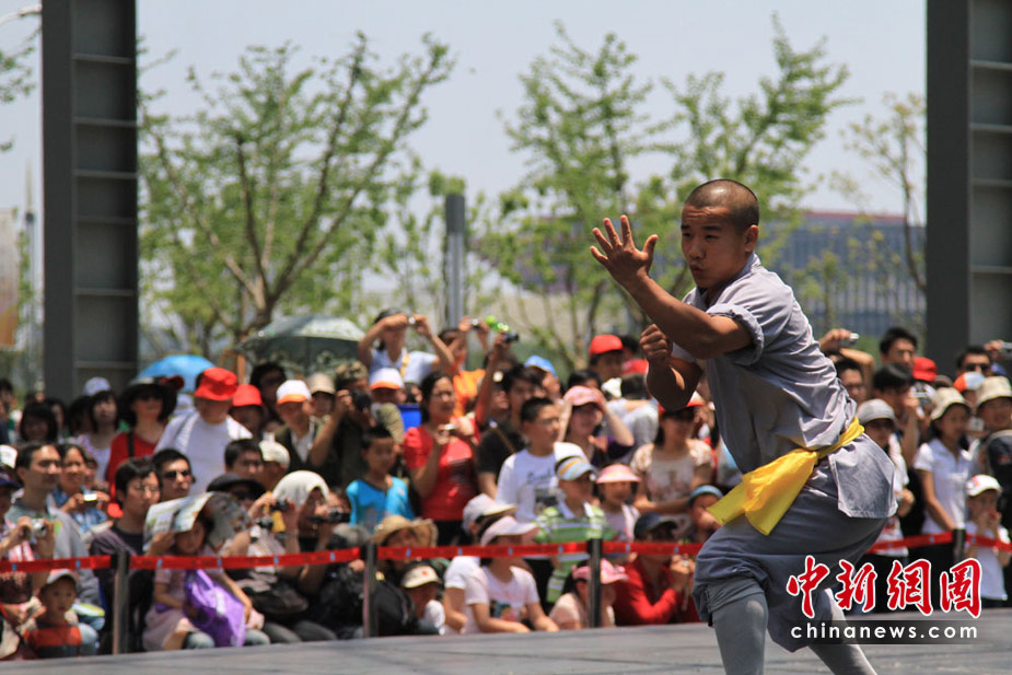 自5月1日開始,上海世博園D片區(qū)綜藝廣場每天都有少林寺功夫展演,受到世博參觀者的熱捧。中新社記者 殷春永攝
