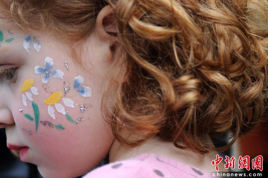 當地時間2010年6月6日,英國倫敦舉行卡姆登綠色市集(Camden Green Fair),這是英國倫敦每年環保領域的“重頭戲”。本屆市集的主旨是要喚起大眾對環境問題的關注,選擇更加可持續發展的生活方式。據活動主辦方預計,本屆市集將吸引來自英國各地和世界各國的2萬多人參加。圖為可愛的英國小女孩兒臉上的環保圖案。Fiona/攝 Fiona 馬小剛/文
