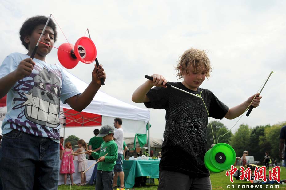 當(dāng)?shù)貢r間2010年6月6日,英國倫敦舉行卡姆登綠色市集(Camden Green Fair),這是英國倫敦每年環(huán)保領(lǐng)域的“重頭戲”。本屆市集的主旨是要喚起大眾對環(huán)境問題的關(guān)注,選擇更加可持續(xù)發(fā)展的生活方式。據(jù)活動主辦方預(yù)計,本屆市集將吸引來自英國各地和世界各國的2萬多人參加。圖為抖空竹是個時髦運(yùn)動。Fiona/攝 Fiona 馬小剛/文