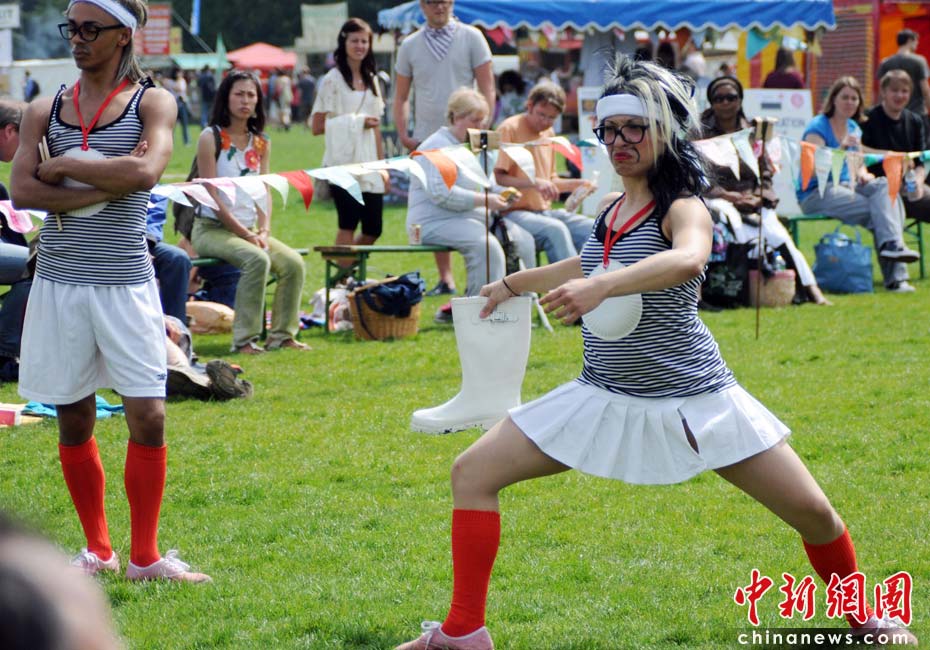 當(dāng)?shù)貢r(shí)間2010年6月6日,英國(guó)倫敦舉行卡姆登綠色市集(Camden Green Fair),這是英國(guó)倫敦每年環(huán)保領(lǐng)域的“重頭戲”。本屆市集的主旨是要喚起大眾對(duì)環(huán)境問題的關(guān)注,選擇更加可持續(xù)發(fā)展的生活方式。據(jù)活動(dòng)主辦方預(yù)計(jì),本屆市集將吸引來自英國(guó)各地和世界各國(guó)的2萬多人參加。圖為活動(dòng)志愿者組織大家玩兒傳統(tǒng)的夏季游戲“扔靴賽”。Fiona/攝 Fiona 馬小剛/文