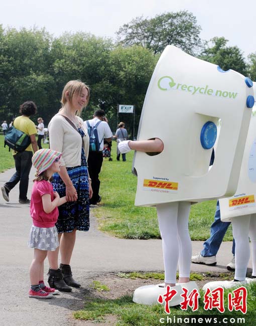 當(dāng)?shù)貢r(shí)間2010年6月6日,英國(guó)倫敦舉行卡姆登綠色市集(Camden Green Fair),這是英國(guó)倫敦每年環(huán)保領(lǐng)域的“重頭戲”。本屆市集的主旨是要喚起大眾對(duì)環(huán)境問(wèn)題的關(guān)注,選擇更加可持續(xù)發(fā)展的生活方式。據(jù)活動(dòng)主辦方預(yù)計(jì),本屆市集將吸引來(lái)自英國(guó)各地和世界各國(guó)的2萬(wàn)多人參加。圖為志愿者穿著電水壺模型向游客講解回收廢舊家用電器的重要性,號(hào)召人們從節(jié)約資源、防止化學(xué)污染兩方面考慮都要盡量回收廢棄的家用電器。Fiona/攝 Fiona 馬小剛/文