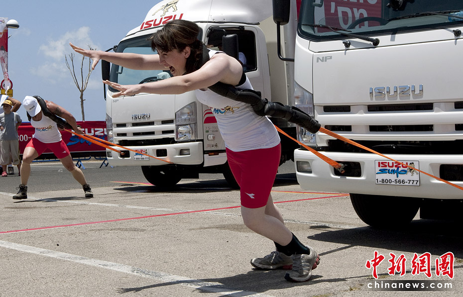 6月8日,以色列在海濱城市特拉維夫舉行了拉卡車大賽。比賽要求將一臺7.5噸的卡車拉到30米以外,用時最短者為勝者。該項賽事不但吸引了世界上眾多男性大力士,更有許多女性大力士出戰。圖片來源:中國新聞網