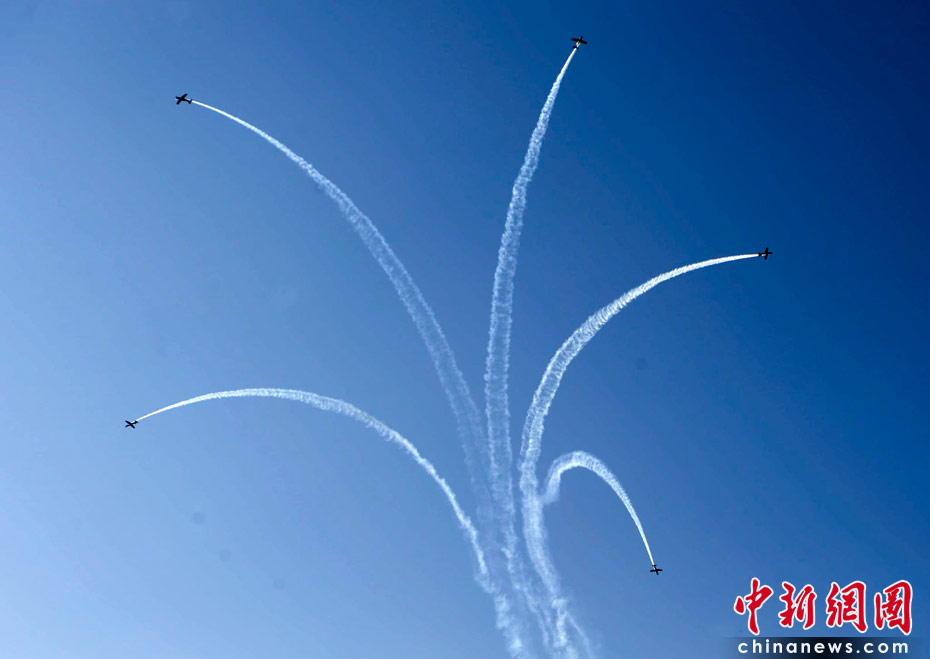當地時間6月9日,南非約翰內斯堡足球城,飛行表演隊在進行演練。中新社發 廖攀 攝