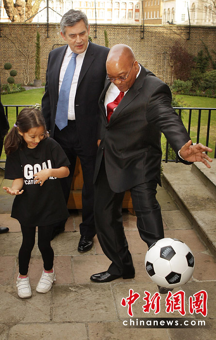圖為2010年3月4日,英國倫敦,正在英國訪問的南非總統祖馬在唐寧街10號與英國首相布朗舉行會晤,其間還在露臺上跟小學生玩起了足球。今年世界杯將于6月在南非舉行。