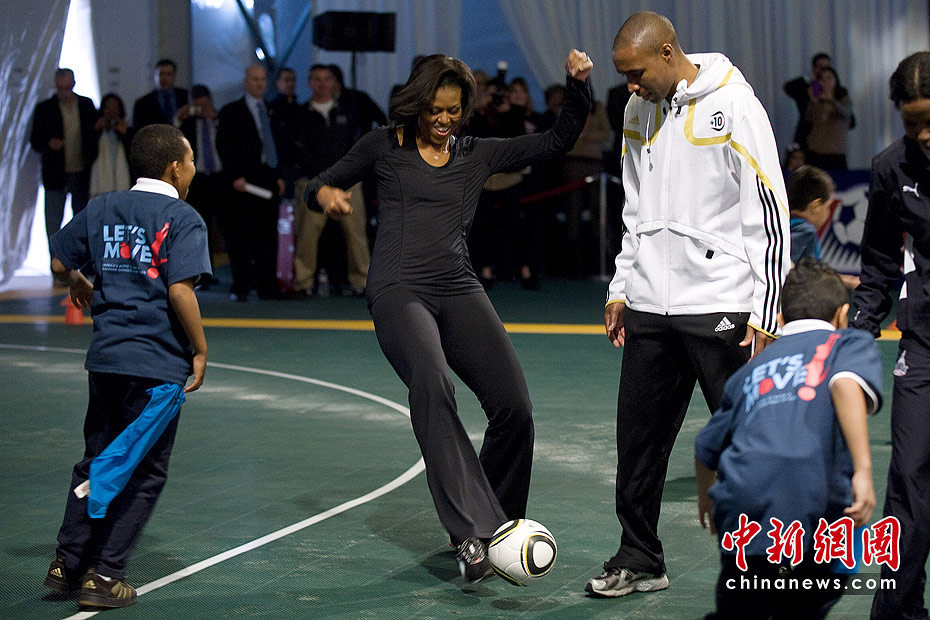 圖為2010年3月5日,美國第一夫人米歇爾·奧巴馬在華盛頓參加了由美國足球基金會組織的一項慈善活動,米歇爾在活動現場與小朋友們一起享受快樂足球。該活動旨在抵制兒童肥胖,鼓勵孩子們選擇更加健康積極的生活方式。