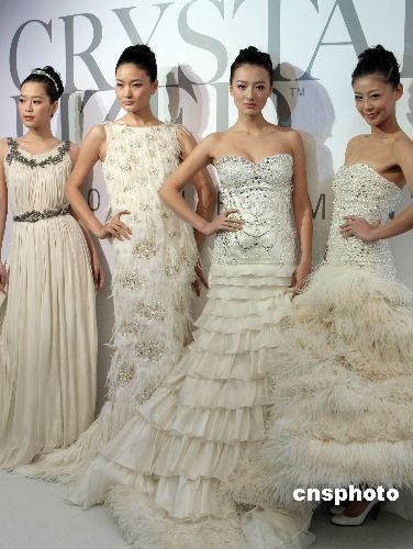 11月18日,一場時尚婚禮匯展在上海舉行,耀眼奪目的水晶婚紗禮服吸引了不少參觀者的“眼球”。圖為模特展示水晶婚紗禮服。中新社發 湯彥俊 攝
