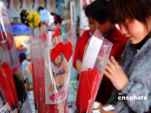 2月13日,在河北邯鄲廣平縣一家禮品商店,年輕女孩們在選購內衣。情人節臨近,一種用內衣、絲巾等做成“花蕊”狀的“玫瑰花”,受到年輕人歡迎。中新社發 程學虎 攝
