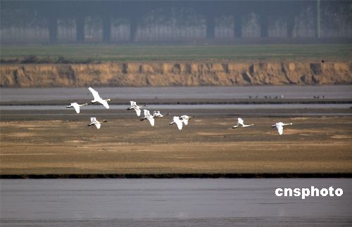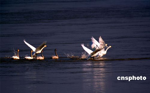 十一月二十日,來自北方的大天鵝在鄭州黃河上空飛翔、在水中嬉戲。這是今年入冬以來,發(fā)現(xiàn)的大天鵝最大的種群。連日來,鄭州黃河濕地保護區(qū)工作人員連續(xù)在保護區(qū)內(nèi)進行鳥情觀察,共發(fā)現(xiàn)國家二級保護動物大天鵝九十三只和灰鶴兩只,以及大種群分布的豆雁一千三百余只,綠頭鴨五百三十只,大白鷺三百三十二只。據(jù)推算,各種水鳥達到三十萬只。中新社發(fā) 慎重 攝