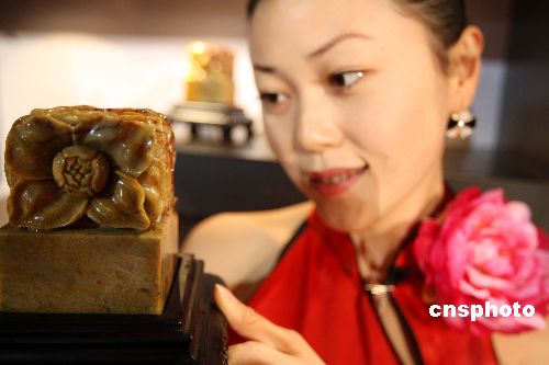 十二月二十日,北京奧組委在奧林匹克大家庭總部飯店北京飯店舉行壽山石奧運特許商品“中國牡丹印”首發儀式。歷史悠久、雕工精美的壽山石印,承載著“中國印·舞動的北京”與印鈕部分國色天香、雍容華貴的牡丹交相輝映。此次隆重推出的“牡丹印”是壽山石奧運文化精品系列的首批代表作,限量2008枚。該印采用中華國石之首壽山石與國花牡丹相結合,選材為“中華印石三寶”的壽山芙蓉石脈,可稱得上是精品中的精品。中新社發 任海霞 攝