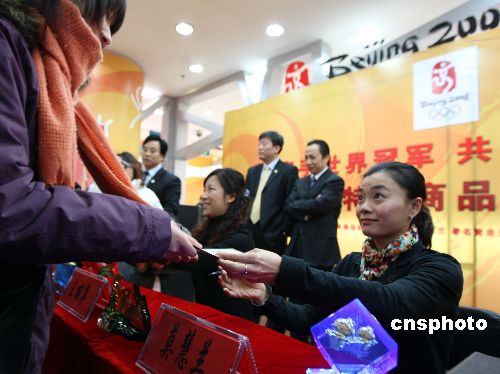 一月二十二日,前世界體操冠軍莫慧蘭與悉尼奧運(yùn)會(huì)競(jìng)走冠軍王麗萍在北京為購(gòu)買(mǎi)奧運(yùn)特許商品的市民簽字留念,為奧運(yùn)特許新品助陣。中新社發(fā) 任海霞 攝