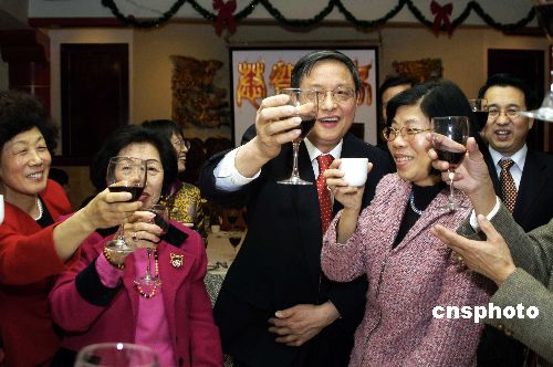 中國駐美大使周文重(中)及夫人謝淑敏女士(左一)和駐美使館領事部全體外交官1月26日來到華盛頓特區唐人街,向大華府地區各僑社領袖拜年。圖為周文重大使向僑領敬酒。中新社發 邱江波 攝