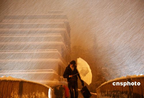1月27日晚,行人在紛飛的大雪中和被積雪覆蓋的道路上艱難的行走。當晚,江蘇省南京市再次出現中到大雪的降雪過程,部分地區降雪量達10毫米以上,局部地區出現暴雪,江蘇省氣象臺在當晚18時20分首次將暴雪黃色預警變更為暴雪橙色預警,提醒相關部門和市民做好防雪災、防凍害和道路清掃、積雪融化工作。中新社發 鐘山 攝