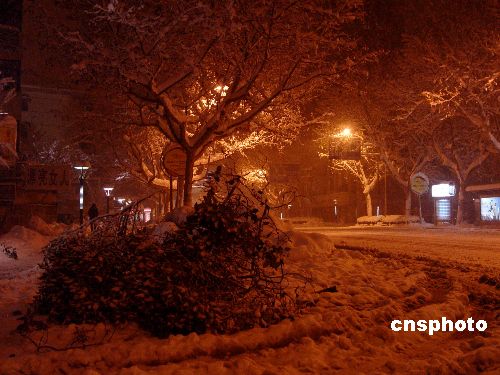 1月28日凌晨,江蘇南京漢中門大街路旁,部分樹(shù)枝不堪重負(fù),被厚重的積雪壓斷。連日持續(xù)的暴雪襲擊江蘇,積雪已達(dá)20多厘米。據(jù)氣象部門發(fā)布,這是近10年來(lái)江蘇罕見(jiàn)的連續(xù)性大面積強(qiáng)雨雪天氣。中新社發(fā) 胡高華 攝