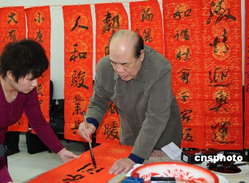 2月1日,中國書法家協會組織著名書法家二十余人到北京近郊農村書寫春聯,把喜慶送到普通農民家庭。中新社發 楊佐桓 攝