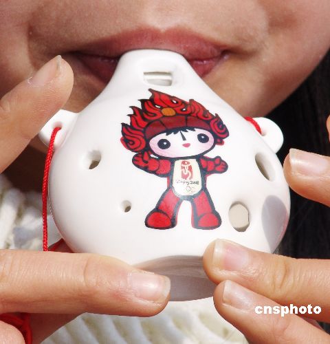 在江西省景德鎮營業員吹奏“唱響福娃塤”。